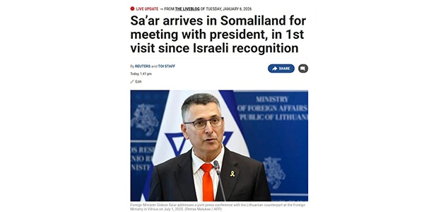 وصل وزير خارجية الاحتلال الصهيوني الارهابي جدعون ساعر، اليوم الثلاثاء، إلى إقليم أرض الصومال، في زيارة رسمية هي الأولى من نوعها منذ إعلان سلطات الاحتلال اعترافها بالإقليم، لعقد لقاءات مع رئيس أرض الصومال وعدد من المسؤولين.