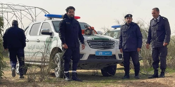 ضبط فرع الشرطة الزراعية صرمان خلال جولة تفتيشية على غابة صرمان الجنوبية، عامل أجنبي يستخدم منشارًا آليًا لقطع الأشجار داخل مشروع الموز.